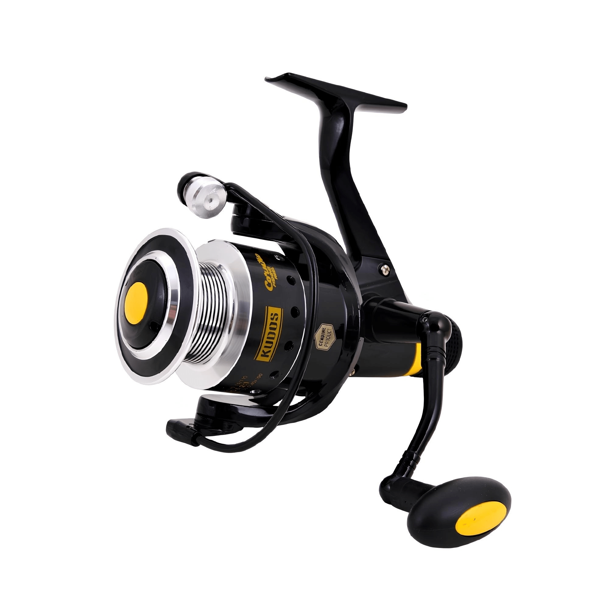 •  Фрикционный тормоз защищает катушку от поломок. При сильном натяжении лески шпуля поворачивается на оси, спуская леску. Механизм фрикционного тормоза устанавливается производителями спереди или сзади катушки. Обе конструкции одинаково предохраняют катушку от рывков и поломок механизма. При переднем положении тормоза ручка его регулировки находится на шпуле, а при заднем натяжение проводят расположенным на корпусе регулятором.
