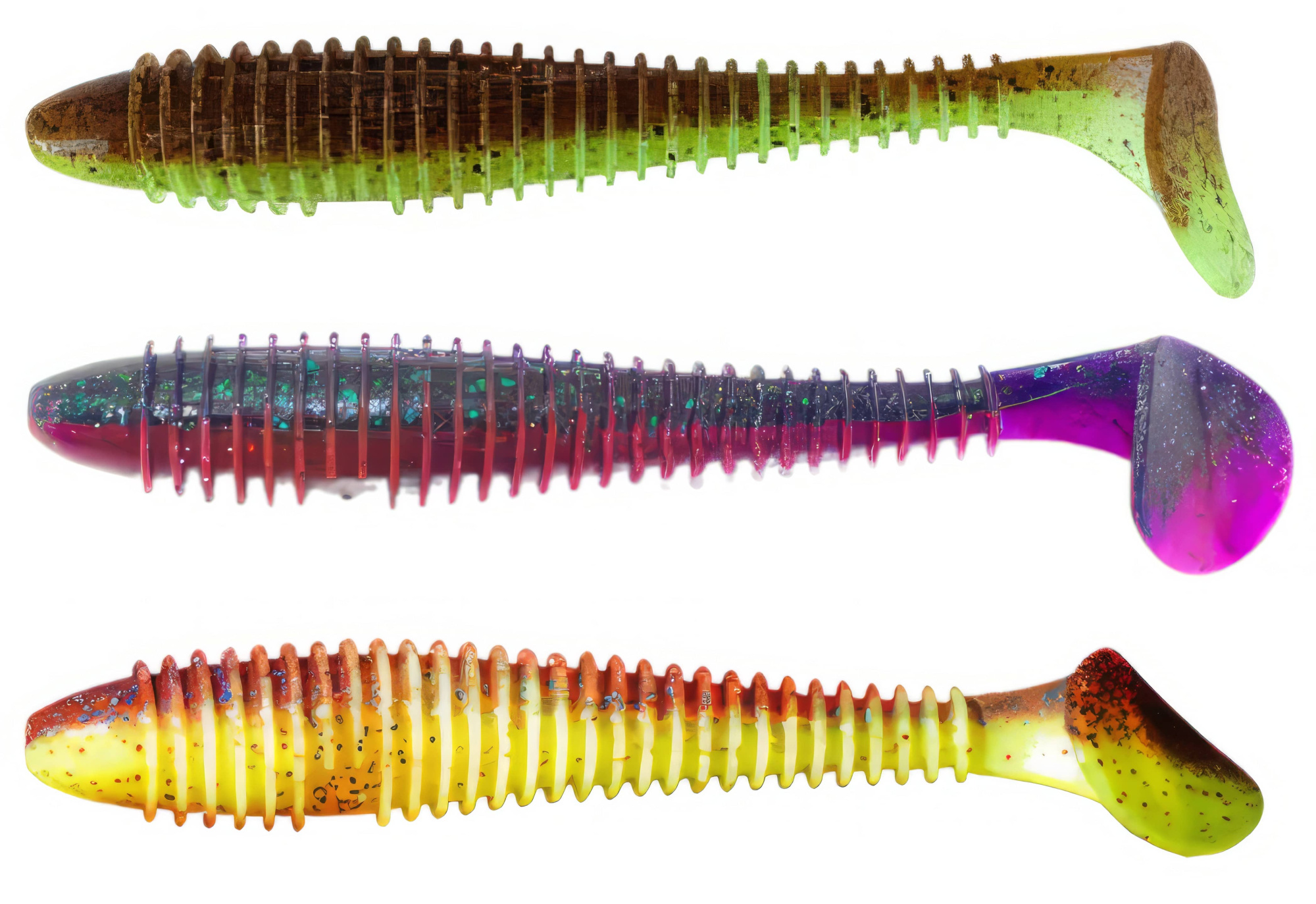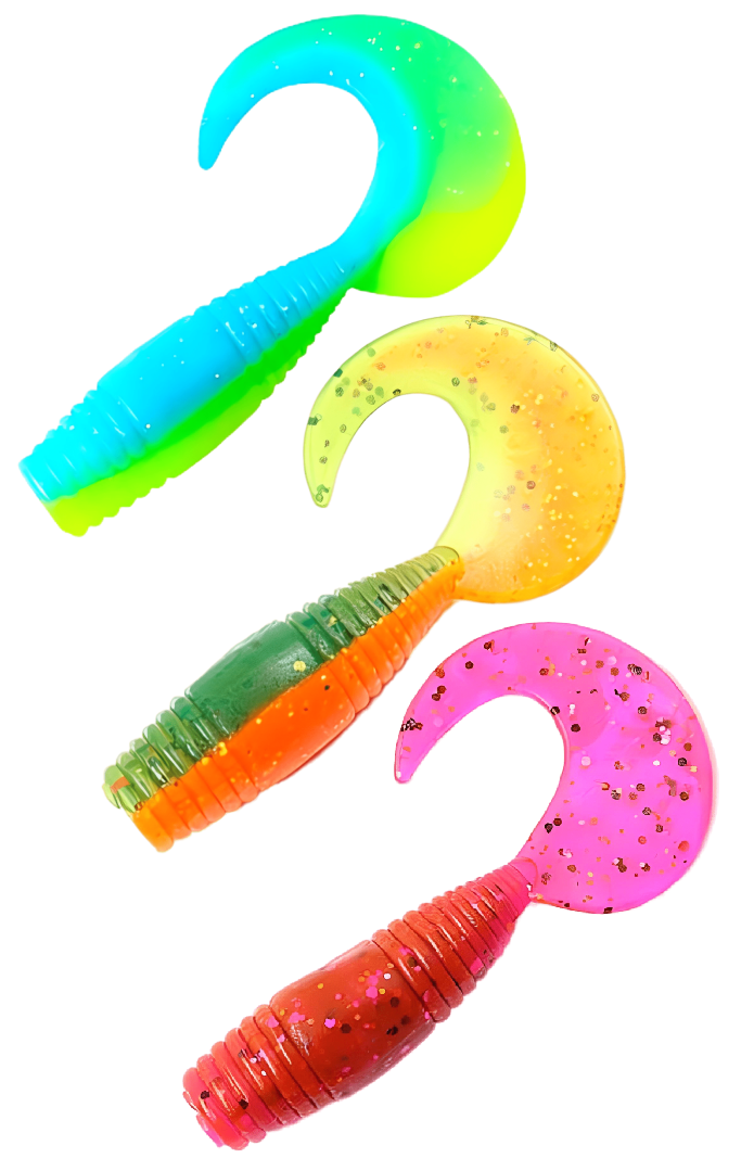 Твистеры — это активные приманки, отличающиеся цилиндрической формой тела, которое может быть тонким, объемным, коротким или длинным. Поверхность твистера может быть гладкой, с легким рельефом или ярко выраженной ребристостью, что создает дополнительные акустические эффекты во время проводки, привлекая хищников. Ключевой особенностью твистера является его хвост, который, словно вопросительный знак, изгибается и создает частые колебания. Размеры, толщина и степень изогнутости хвоста у разных моделей могут различаться, что влияет на характер игры приманки. Хищные рыбы издалека замечают эти вибрации и стремительно бросаются в атаку. Твистеры часто используются в сочетании с разнесенной оснасткой, дроп-шотом и отводным поводком, что позволяет разнообразить методы ловли.